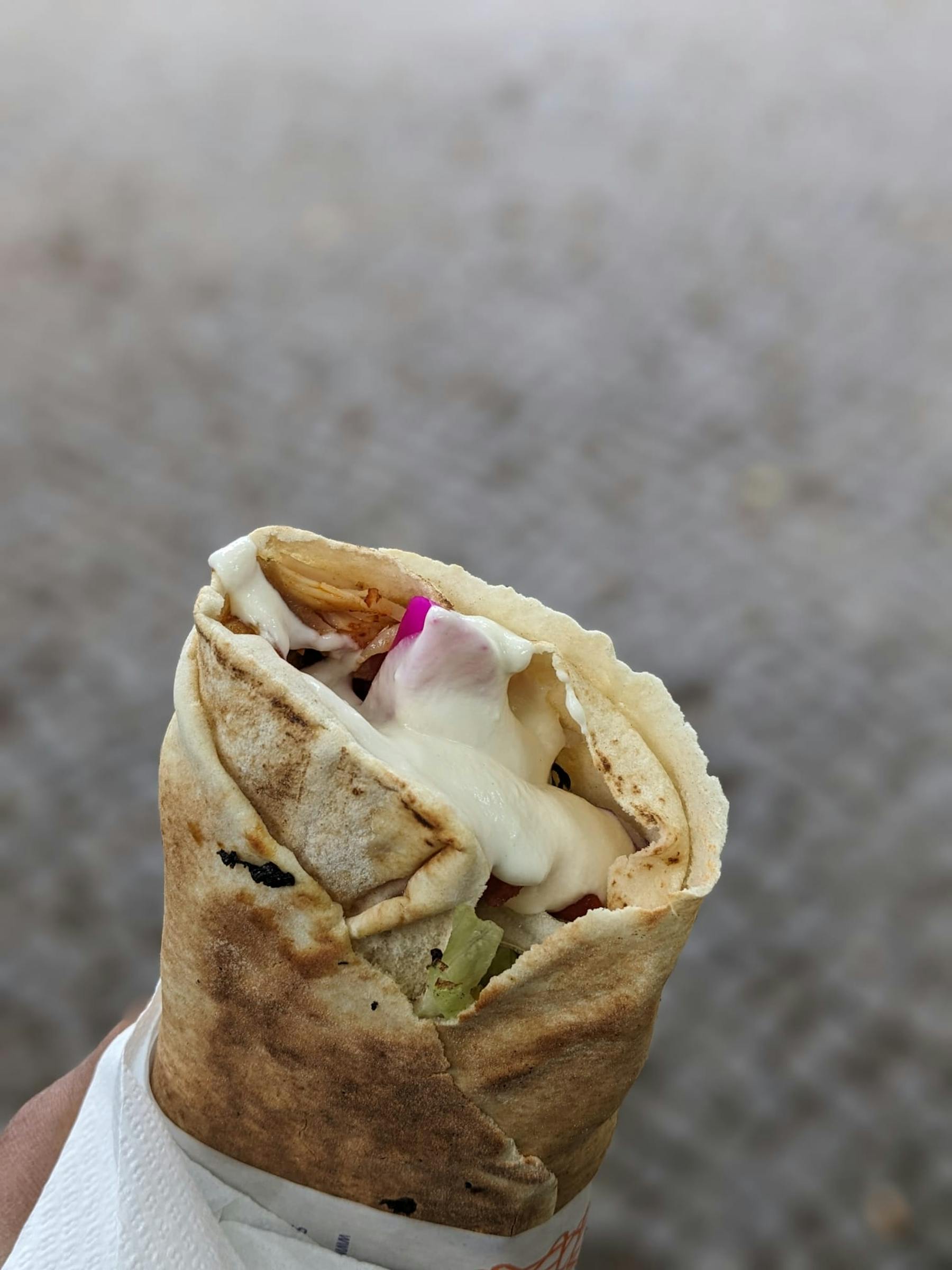 A really big and sloppy shawarma with decent chicken, sadly very underflavoured. The garlic sauce is pretty weak, and there's a lot of low-seasoned salad in there making it quite underwhelming. Really filling for 6EUR, but there's definitely better ones in the very near vicinity.
